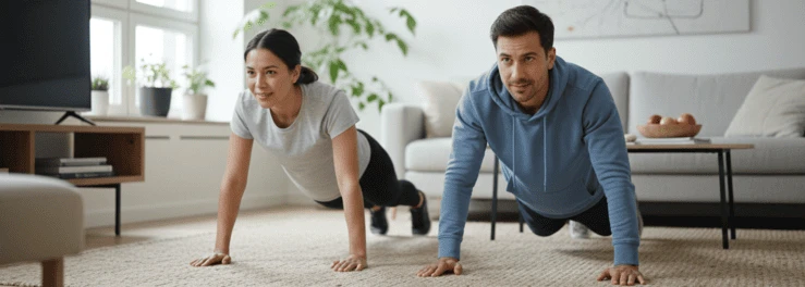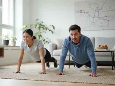 - Силовые упражнения с собственным весом. Отжимания, приседания, планка не требуют наличия оборудования и занимают 15–20 минут. Мышечная ткань более энергозатратна, чем жировая, поэтому даже небольшое увеличение мышечной массы ускоряет метаболизм.